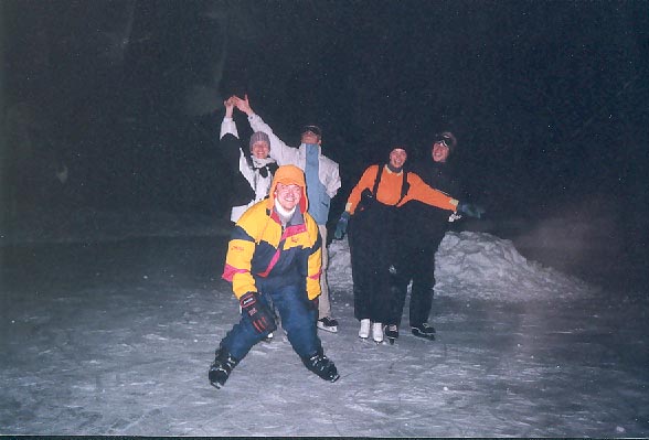 Vasia, Mary, me, Olga and Daniel ice-skating. We are all heavily drunk and didn't even change the clothes after snowboarding.